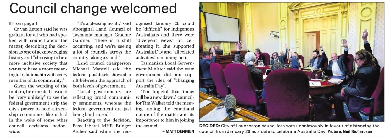 The City of Launceston council will change how it recognises Australia Day in what is hoped to be a "new dawn" for the municipality after an at times emotional meeting on Thursday. Tasmanian Aboriginal leaders have welcomed the decision, with state and federal government representatives largely dismissing it.